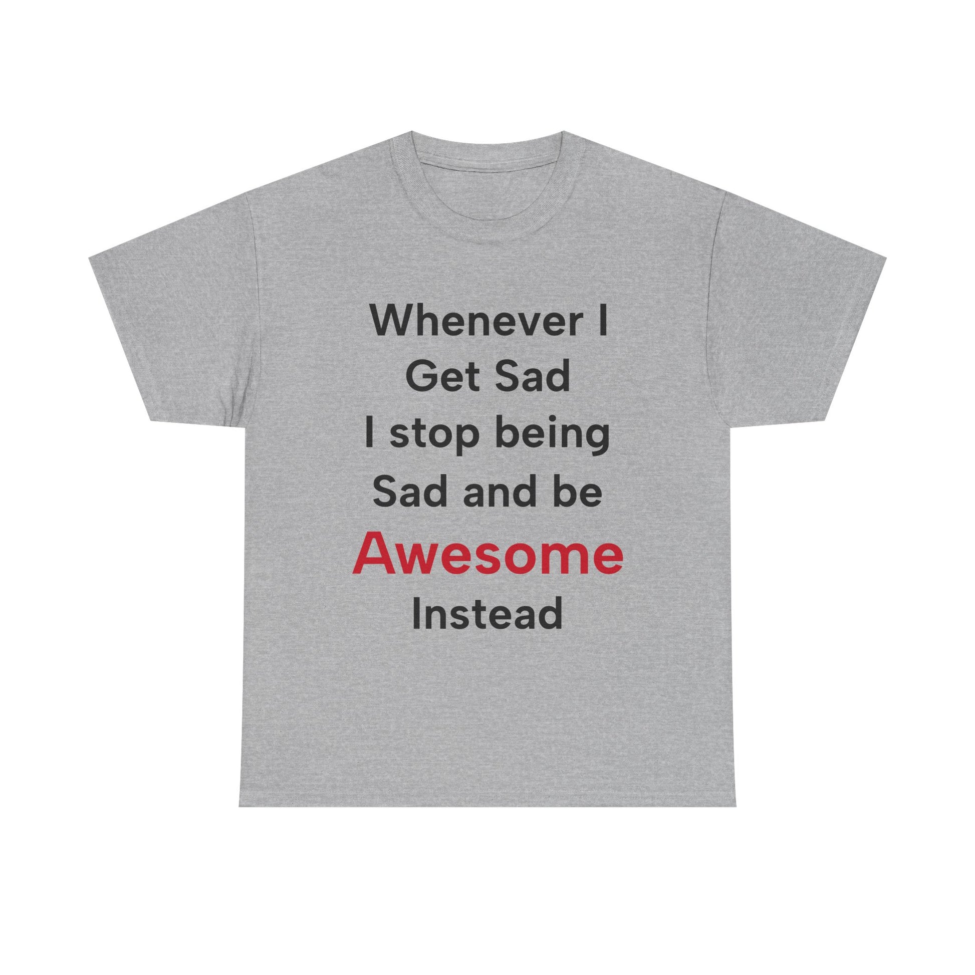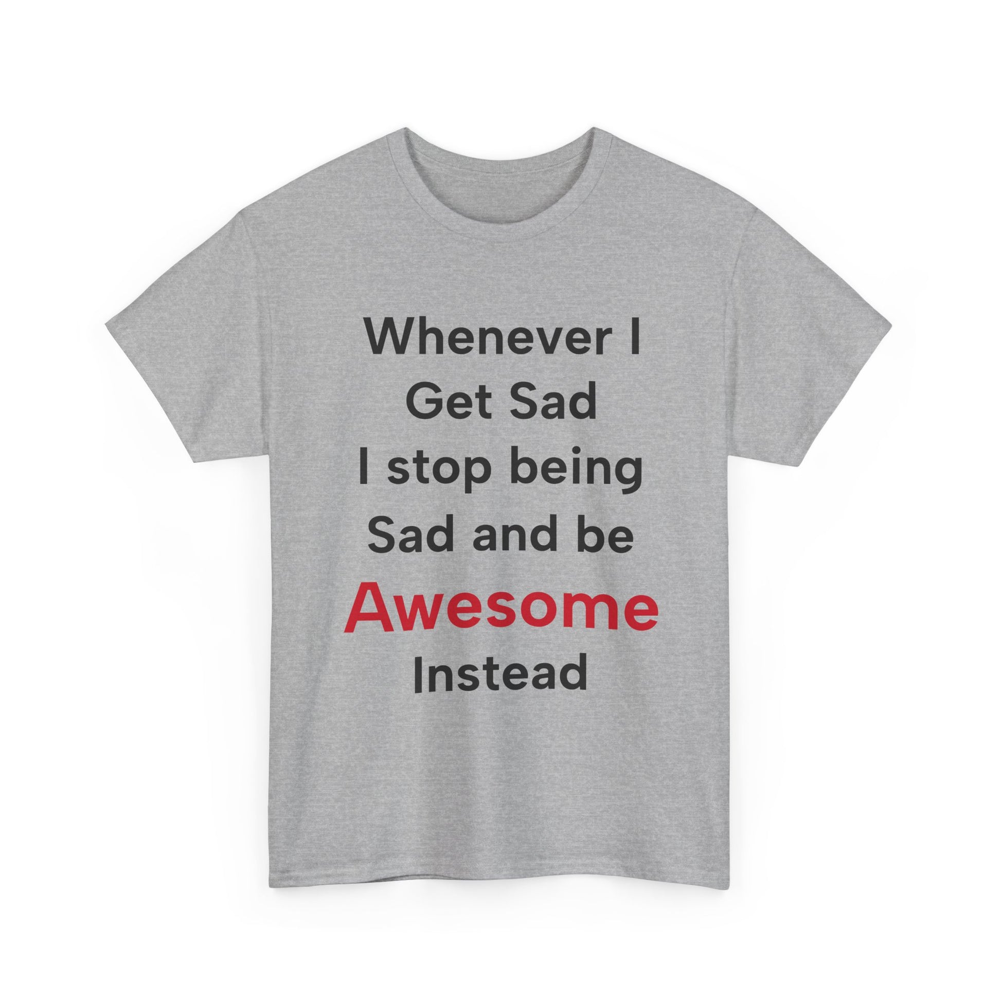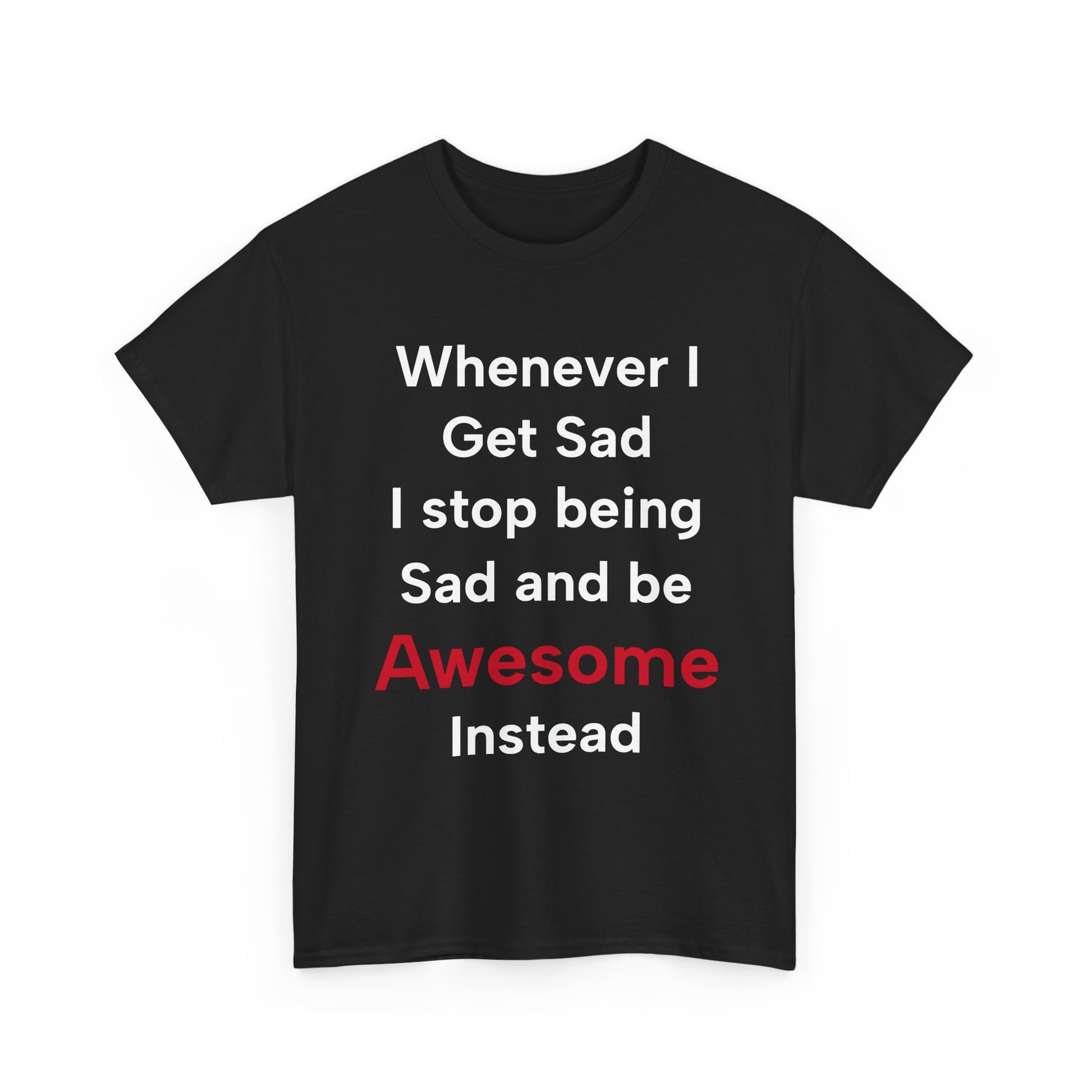 Design: White t-shirt with "Whenever I get sad I stop being sad and be awesome instead" in black and vibrant red text.
